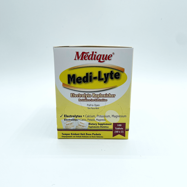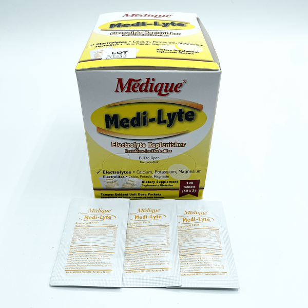 Medique Medi-Lyte is an electrolyte replenisher. 50 (2) packs in easy access box. These are amazing for replacing the bodies natural electrolytes. Works great for before and after physical exertion, headaches, dehydration, flu symptoms. Contains calcium, potassium, magnesium. All natural electrolytes the body needs to function and repair itself. 2 tablets is equivalent to 5 sports drinks. Extremely important for the body after any type of burn from sun burn to 3rd degree burn. Body looses most of its electrolytes out of the damaged tissue. These are one of our hottest items.
