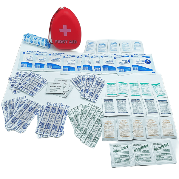 Mini Red portable first aid kits are compact, lightweight and packed with quality first aid products for emergencies. The mini kit comes in handy in a bright red water resistant case that contains basic supplies to treat minor cuts and abrasions. Perfect for traveling on airplanes and road-trips. Also perfect for ATV, Hiking, Outdoor adventures lightweight, not bulky and easy to carry around.