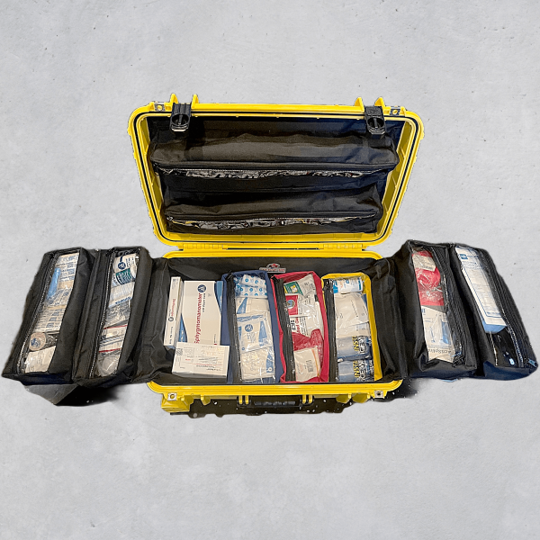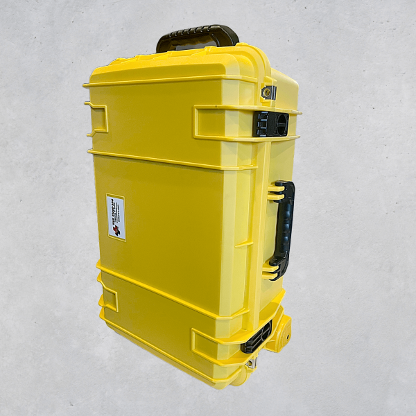 Our Trauma Deluxe Hard case kit is contained in a crush resistant, waterproof case, with retractable handle and wheels for easy carry.  Inside the kit is a custom made heavy Cordura liner with color coded removable pockets.  This kit is manufactured 100% in the USA from the case to the liner.  There is not another design like this out there.  We created it.  Currently only available in Safety Yellow.